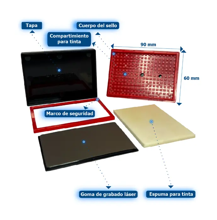 Sello rectangular HY-6090 de 65 × 95 mm, ideal para marcación de textos amplios, logos y firmas en documentos. Incorpora goma de grabado láser de 7 mm y estructura en plástico resistente tipo ABS, con almohadilla de tinta integrada para impresiones uniformes. Ofrece tinta indeleble recargable en varios colores y componentes como tapa protectora y marco de seguridad. Incluye sistema completo listo para uso y personalización. Ideal para oficina; limitación: formato fijo rectangular.